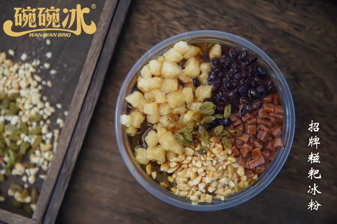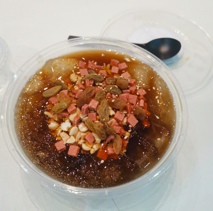 有韧性、有嚼劲的糍粑,甜甜冰冰的红糖,入口即化的冰粉,再加上花生碎、葡萄干、冬瓜糖、西瓜粒、山楂粒,一口就很满足。