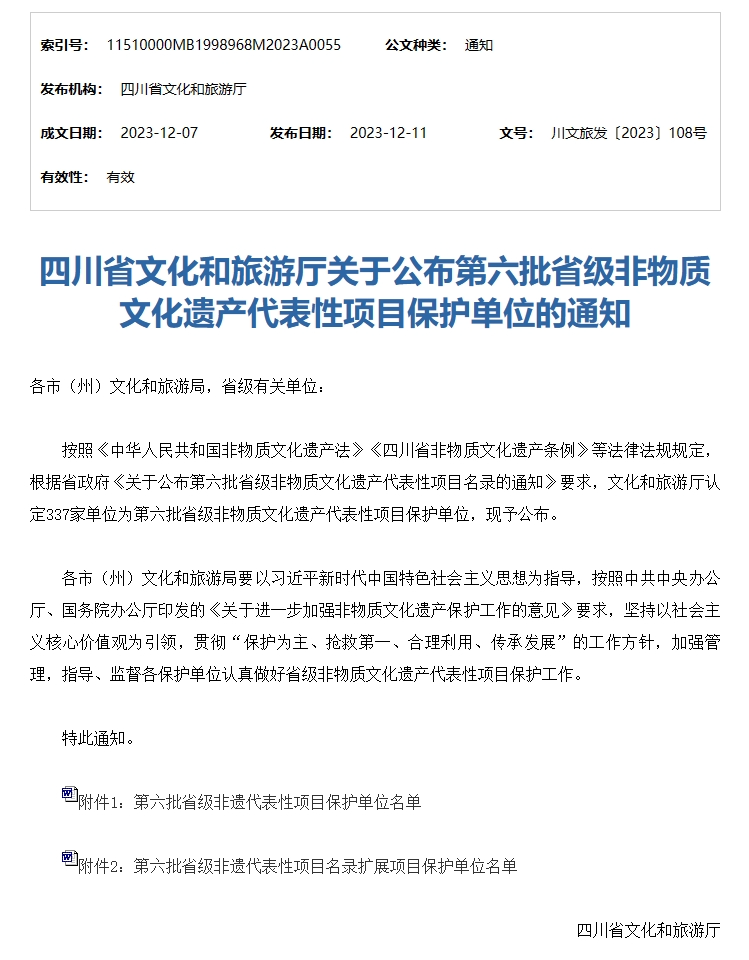 近日,四川省文化和旅游厅发布了《关于公布第六批省级非物质文化遗产代表性项目保护单位的通知》,拟认定337家单位为第六批省级非物质文化遗产代表性项目保护单位。