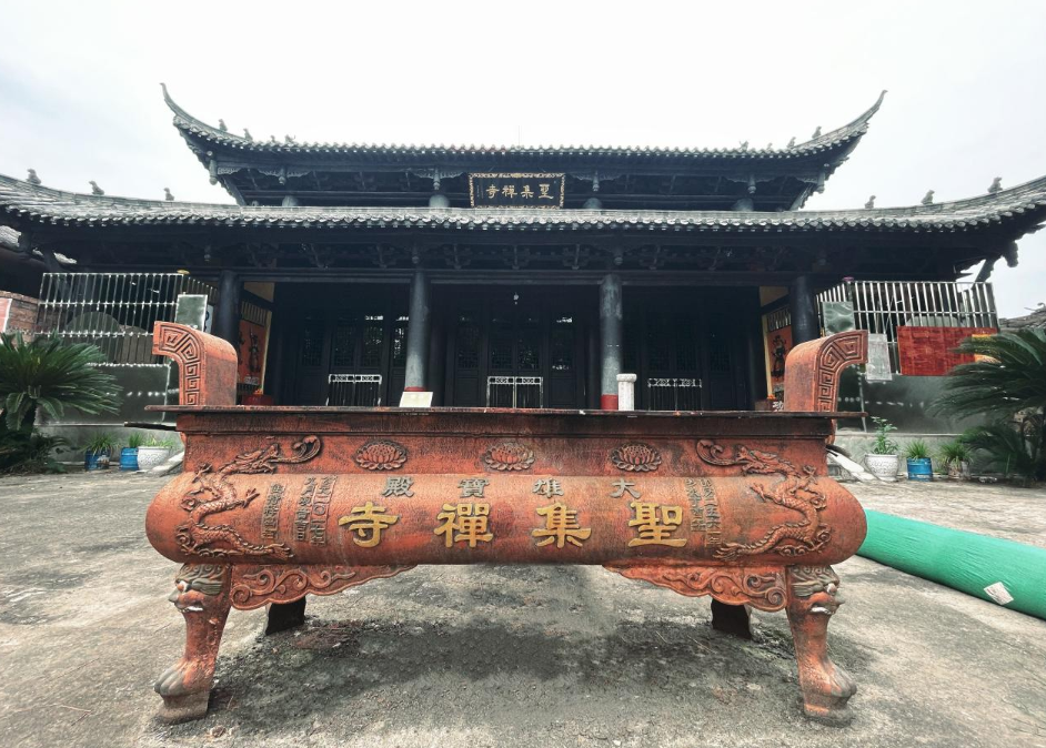 山顶上,有座历史久远的老寺圣集禅寺,原名玉堂寺。玉堂寺曾几次被毁,后于2014年改建为圣集禅寺,古刹饱经磨难,几多废兴,现如今寺院中还保留有一座原来玉堂寺的玉堂殿。寺内的建筑虽大多是现代复建的,但设计精美,黛瓦红墙。