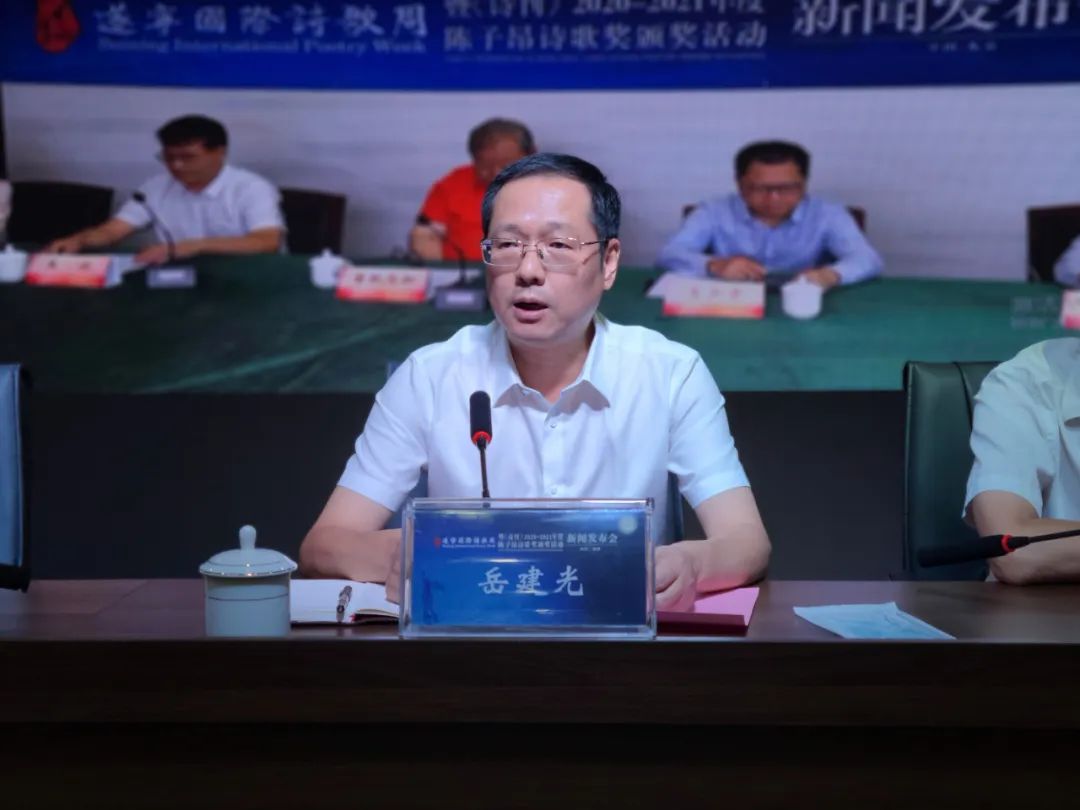 遂宁市委常委、副市长、市直机关工委书记岳建光介绍了遂宁的历史文化概况和本次活动的突出特色,遂宁位于四川盆地中部,涪江中游,是成都平原经济区的重要组成部分、成渝间重要的节点城市。1300多年前,从遂宁走出的大唐“诗骨”陈子昂,留下名篇《登幽州台歌》。时逾千年,诗意不朽,遂宁这片土地不仅弥漫着诗意,更是承袭着诗人陈子昂的风骨与风雅!我们期待中国作家协会、《诗刊》社的领导、国内外著名诗人和媒体界的朋友,用你们手中的生花妙笔,充分展示遂宁悠久的历史、灿烂的文化、良好的投资环境,大力宣传遂宁的科学发展理念,开放的发展思路以及积极与海内外各界加强交流合作的强烈愿望,让更多的朋友了解遂宁、认识遂宁、感受遂宁。