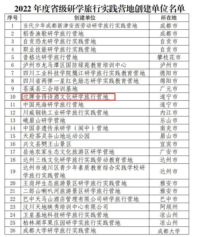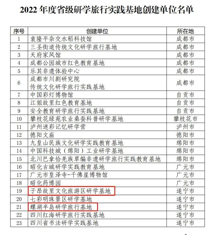 为积极推动落实全省研学旅行大会部署,提升我省研学旅行基地(营地)建设水平,根据《四川省文化和旅游厅四川省教育厅关于启动 2022年度省级研学旅行实践基地(营地)创建工作的通知》,经创建单位自主申报、市(州)文旅和教育主管部门联合初审推荐或高校直接推荐、文化和旅游厅与教育厅组织评审合议,决定批准袁隆平杂交水稻科技馆等 75 个单位为2022 年度省级研学旅行实践基地创建单位,当代少年成都新津安西劳动研学旅行实践营地等30个单位为2022 年度省级研学旅行实践营地创建单位。