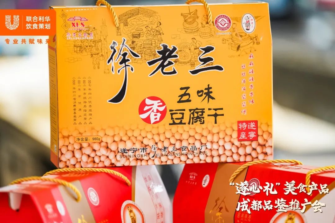 “徐老三”豆腐干传统制作技艺选用遂宁本地优质黄豆为主要原料,采用传统秘方与现代科学工艺相结合的方式精制而成。制作流程需要经过选料、泡豆、磨浆、滤浆、煮浆、点花、成型、压榨、卤制等12道工序,其成品韧而不硬,既香又鲜,经口细嚼,回味悠长,久吃不厌。