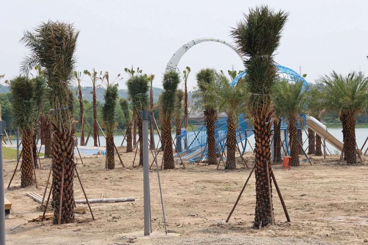 “沙滩的沙都是从北海运来的,整个乐园种植的树木主要以中东海枣、老人葵、亚历山大椰子树以及蒲葵为主,旨在打造遂宁最大的沙滩乐园。”永盛湖沙滩乐园项目现场负责人梁宇豪说。
