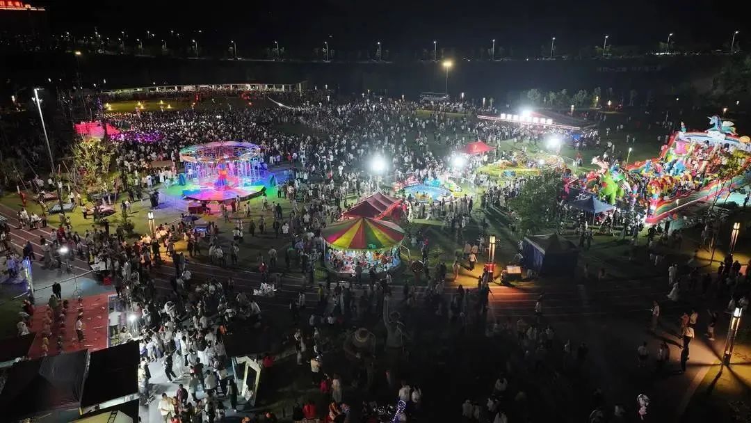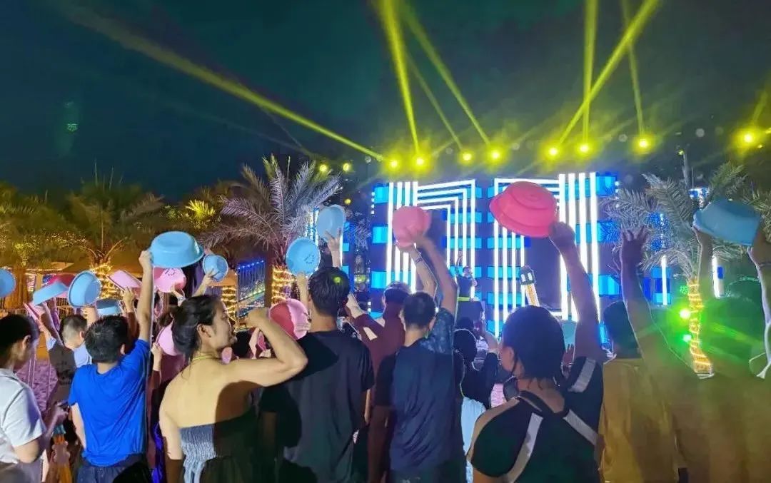 夜幕降临,音乐泼水节开始,大人、孩子纷纷拿着景区准备好的小水盆,你追我赶,尽情体验无忧无虑的童真。