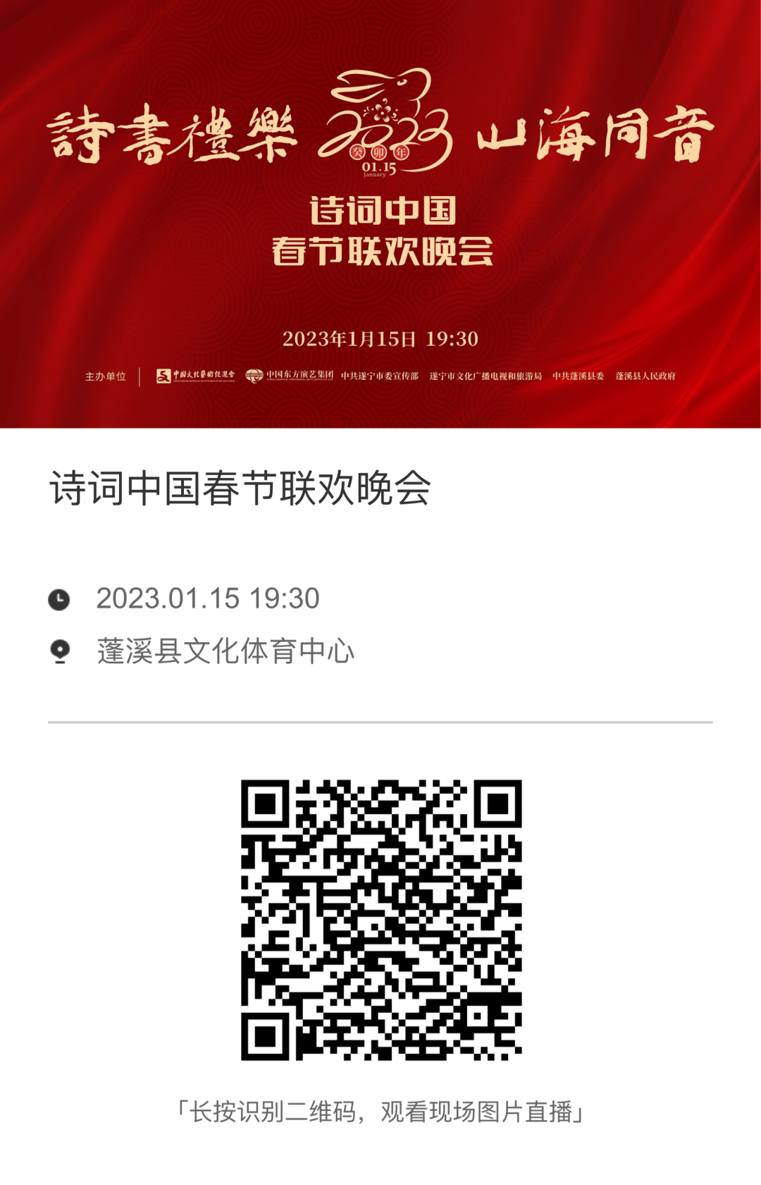 “诗之境阔,词之言长。”诗词被誉为中国人的“文化指纹”,诗词也是中国人骨血中的文化基因。2023年小年夜,一场满载千年诗韵的经典春晚——“诗词中国春晚”将于1月15日晚在四川省遂宁市蓬溪县举办。满载华夏儿女的祝福之声:诗书礼乐,山海同音!