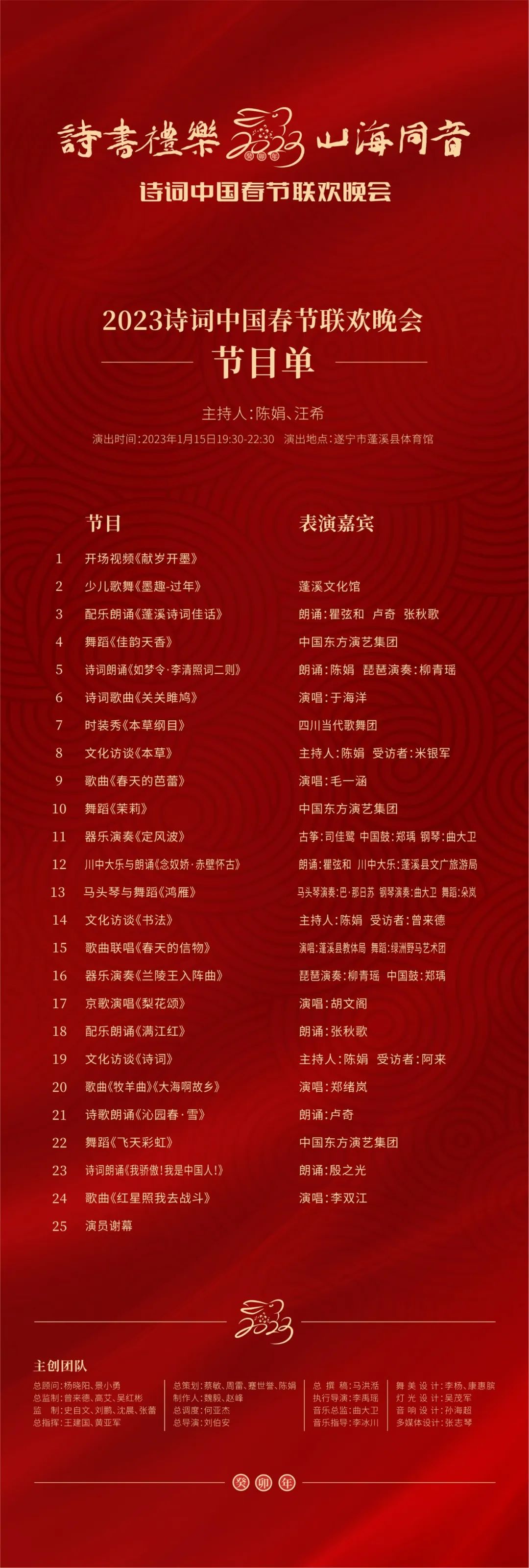 诗书团圆,礼乐和鸣。诗词中国春节联欢晚会(简称“诗词中国春晚”),1月15日蓬溪县体育馆开演。祝福华夏儿女新一年,千里同风,万里共月,吉祥如意。