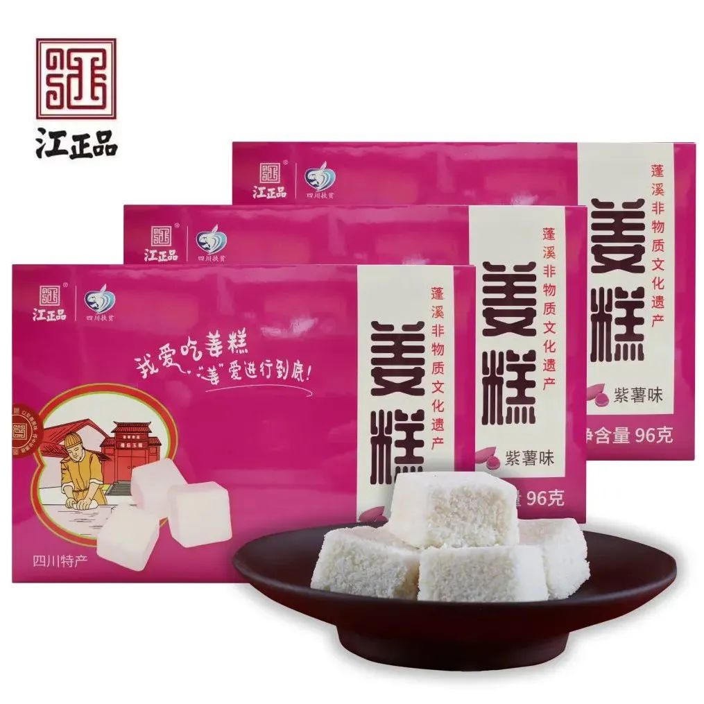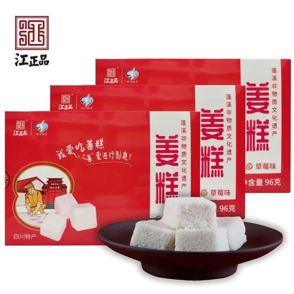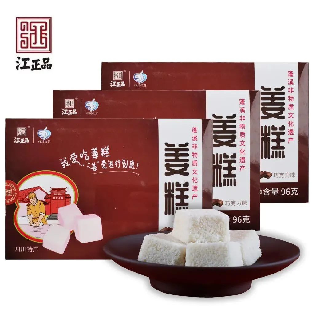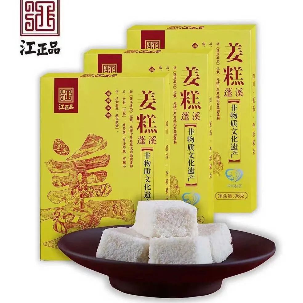 清道光川中糕点名师江正品创制,传承至今150多年。光绪十年,慈禧五十寿诞,四川总督丁宝桢携"蓬溪姜糕"进京贺寿,太后亲封「玉糕」赞曰:“有油不腻,有糖不伤,洁如脂玉,软似秋云” 本品以糯米、生姜、蜂蜜、冰糖、植物油为主要原材的冷加工糕点。