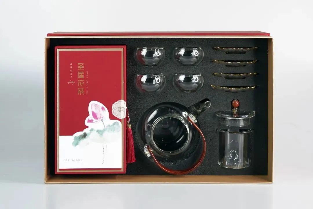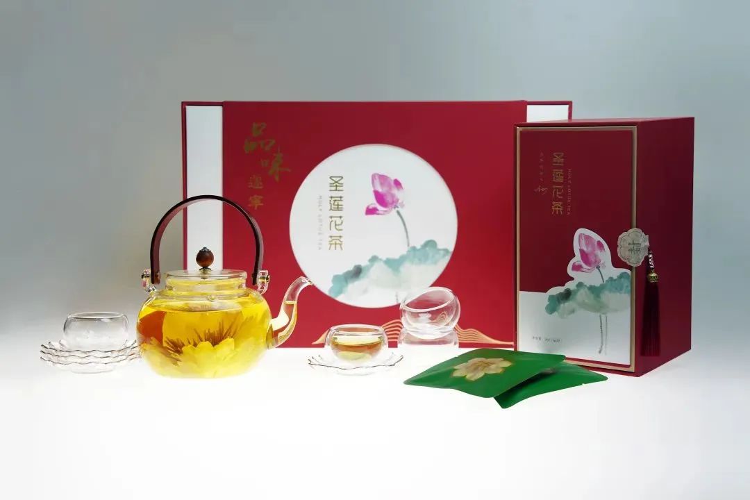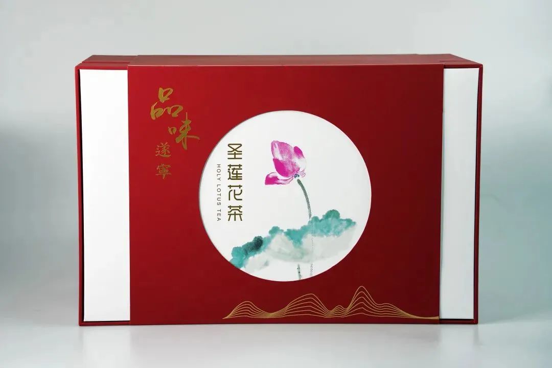 遂宁的市花是荷花,荷花茶是遂宁特产,采用可食荷花为原料,低温烘干制成,荷花茶香气清新纯正,滋味微甘醇厚,汤色金黄鲜亮。包装设计采用喜庆的红色,只要用于中国各喜庆的节日,套装搭配荷花茶和茶具,产品既可单售也可成套售卖。