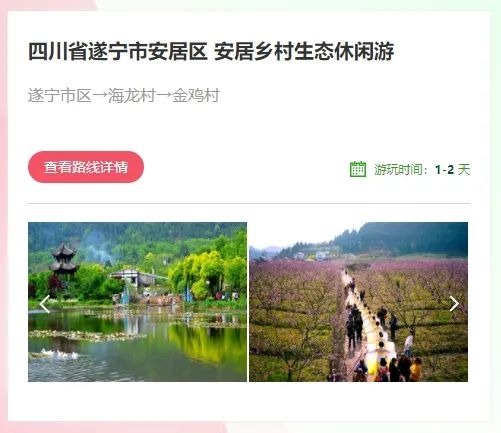3月25日,农业农村部在安徽绩溪举办的2025美丽乡村休闲旅游行(春季)推介活动上,正式发布全国60条春季精品线路和189个精品景点。其中,四川省遂宁市安居区“乡村生态休闲游”上榜啦!