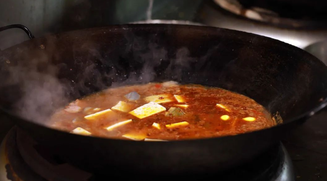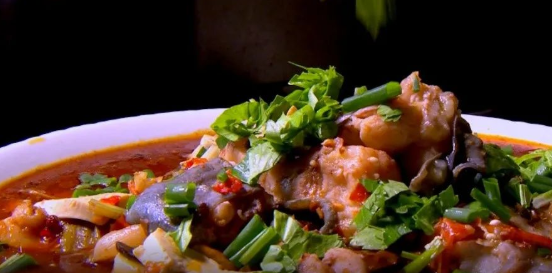 不仅烹制的手艺体现出江湖气息,上菜形式也相当豪爽,往往是大盘盛肉,大盆装汤。一大碗红彤彤的鱼汤,闻起来香气四溢, 而舀起汤里的鱼块,质地竟然跟豆腐一样,用筷子轻轻一夹就碎。入口之后,爽滑细嫩、香辣回甜,油而不腻,鲜而不腥,百吃不厌!