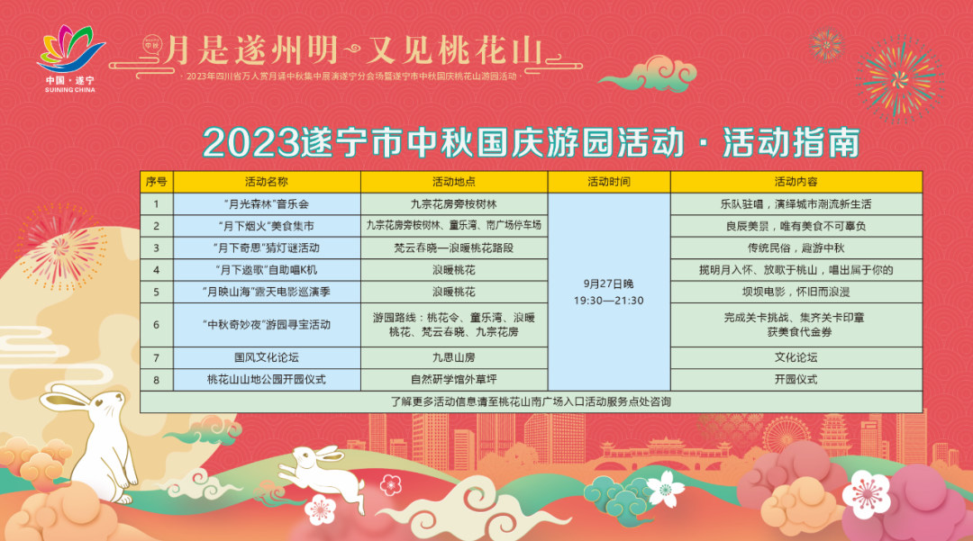 为丰富人民群众节日文化生活深化“我们的节日”系列主题活动弘扬中华优秀传统文化增进节庆体验,营造团圆氛围遂宁将在国庆黄金周期间在桃花山公园开展“中秋国庆游园活动”