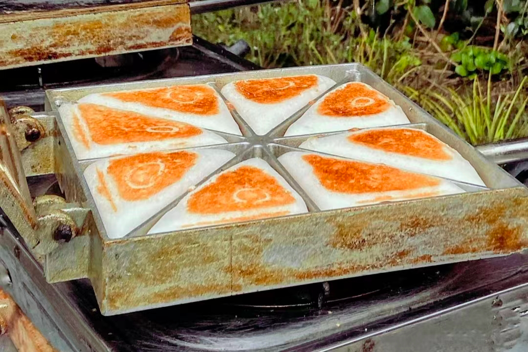 刚出锅的三角糕,完美诠释了,稻米炙烤后的芬香扑鼻,表层烤得金黄焦脆,一口咬下,酥脆无比。