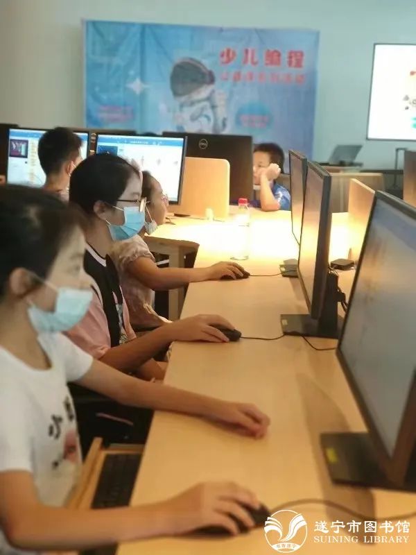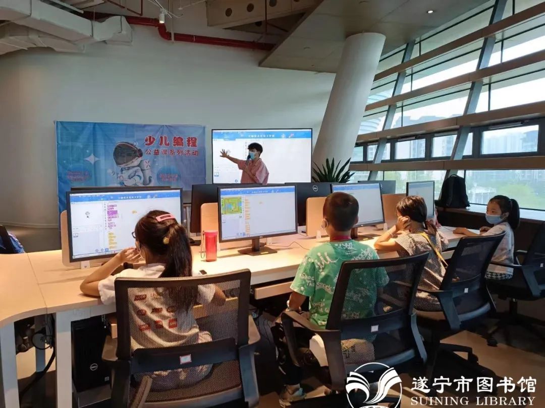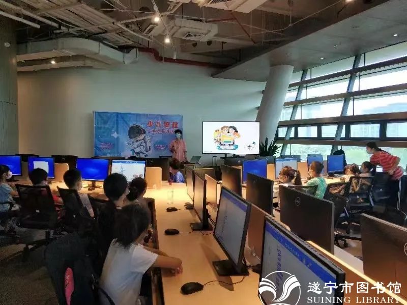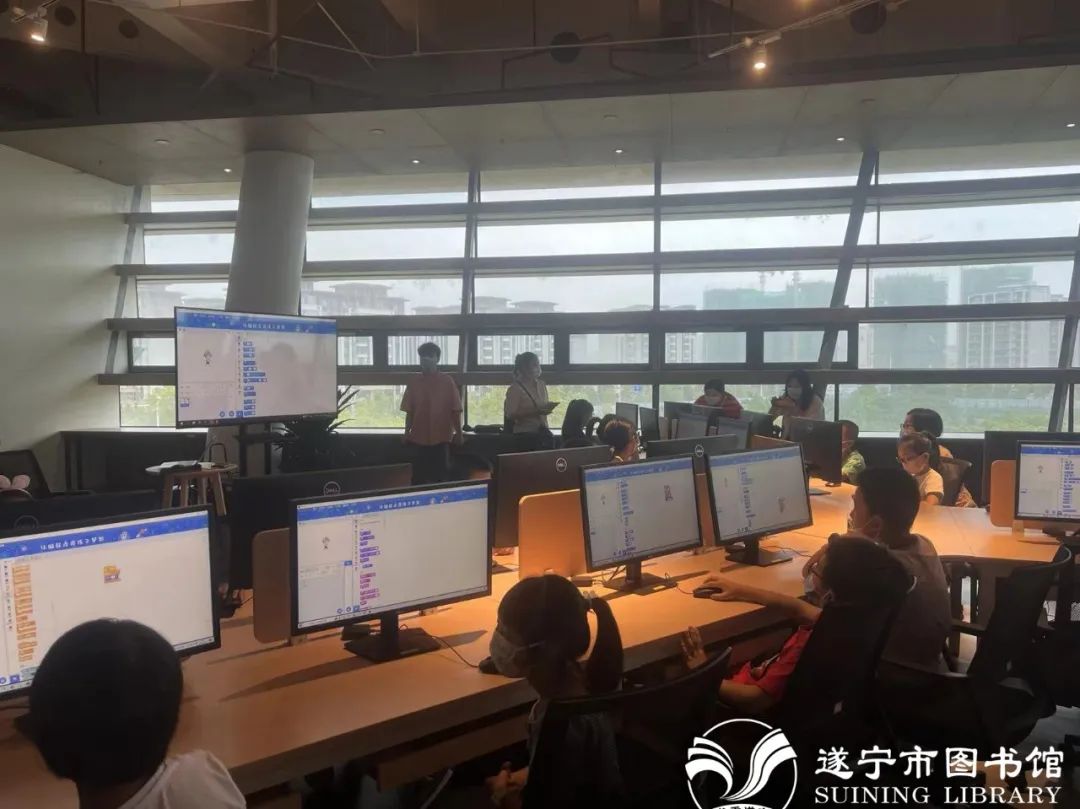 7月23日上午,遂宁市图书馆暑期少儿编程课第一季在图书馆三楼多媒体阅览室开课。