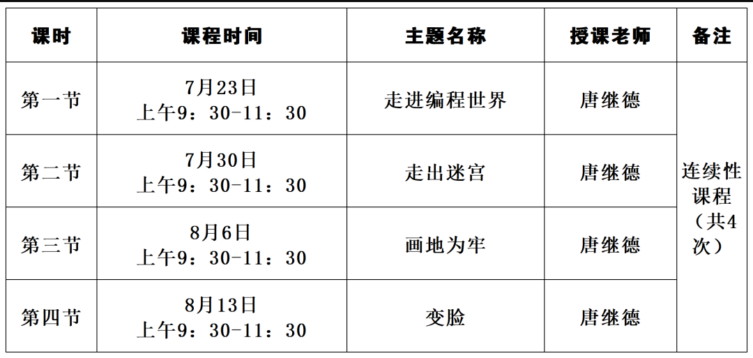 市图书馆本季少儿编程课共四节,7月30日、8月6日和8月13日各有一节课,每节课设置不同的主题。我们希望能通过编程实践,帮助孩子走进编程,喜欢上编程,从而锻炼孩子的逻辑思维,提升专注力与创造力。