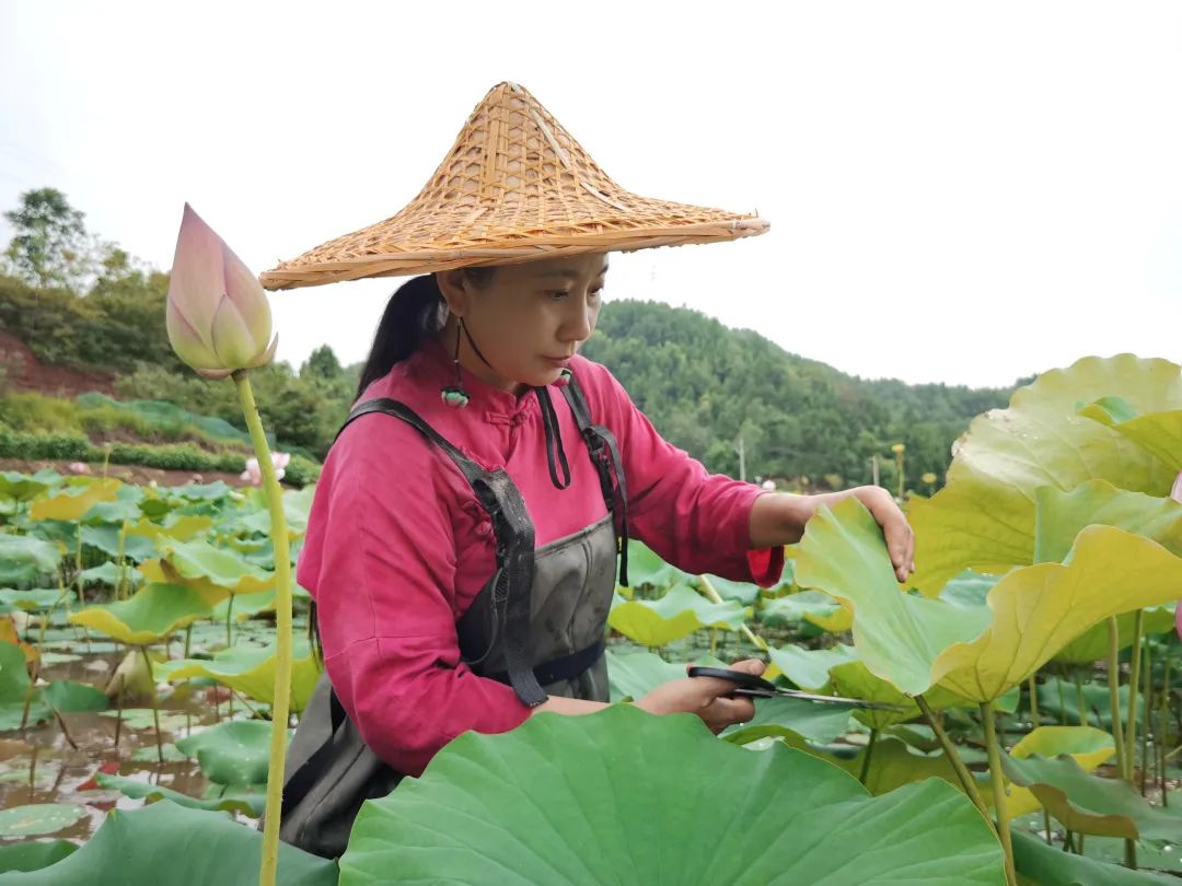 8月盛夏,天蒙蒙亮,在遂宁市船山区永兴镇永和家园莲花种植基地,盛放的莲花点缀在碧绿的荷叶间,随着微风轻轻摇曳。李梅和采莲工人撑船行进其中,忙着采收新鲜的莲花。