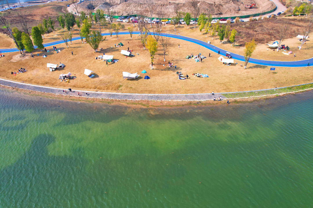 他们似乎也很爱在永盛湖畔游玩,你看他们或在宽阔的环湖路上漫步,或观赏绿植繁花,或静静地坐着休憩,呼吸如洗的空气,欣赏永盛湖春日美丽的湖水山光,有的还在湖岸搭起了帐篷,和我们一样在永盛湖感受惬意时光。