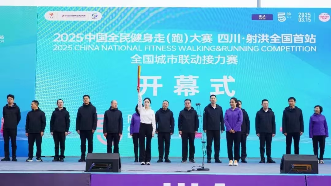 诗酒射洪迎宾客,运动之城展英姿。3月15日,2025中国全民健身走(跑)大赛四川·射洪全国首站全国城市联动接力赛在射洪万达广场鸣枪开赛,来自全国7500名健身爱好者及16个不同国家的国际友人在“诗酒射洪”开启了一场“体育+文旅”的盛会。国家体育总局社会体育指导中心主任、党委书记刘君柱出席开幕式并宣布开赛。国家体育总局社会体育指导中心运动项目二部副主任江志华,四川省体育局二级巡视员文碧伟,遂宁市委常委,射洪市委书记谭晓政,遂宁市委常委、宣传部部长,市总工会主席涂虹,重庆市社会体育指导中心主任王艽,四川省社会体育指导中心主任孙勇,四川旅游学院运动与休闲运动学院院长罗锐,遂宁市委宣传部副部长,市文化广电体育旅游局党组书记、局长魏毅,射洪市委副书记、市长王能等承办城市有关负责同志出席并集体鸣枪开赛。
