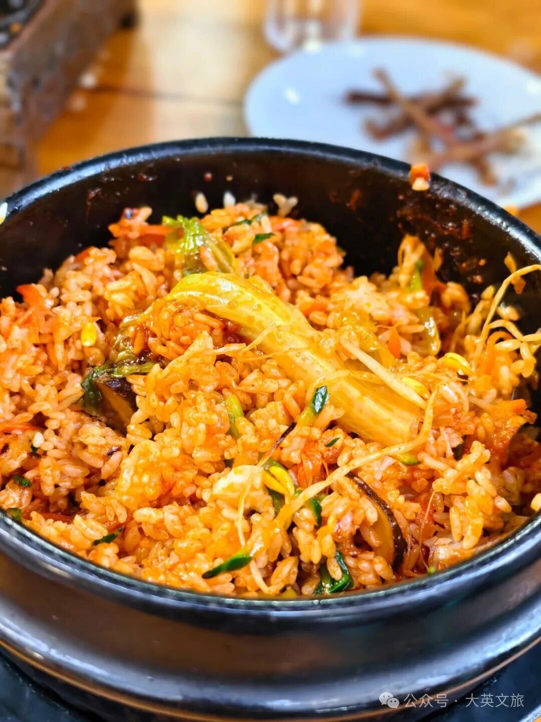 石锅拌饭更是点睛之笔,滚烫的石锅底部烤出金黄酥脆的锅巴,铺上时蔬、煎蛋和秘制酱料,拌匀后每一口都有脆有软、咸香适中。