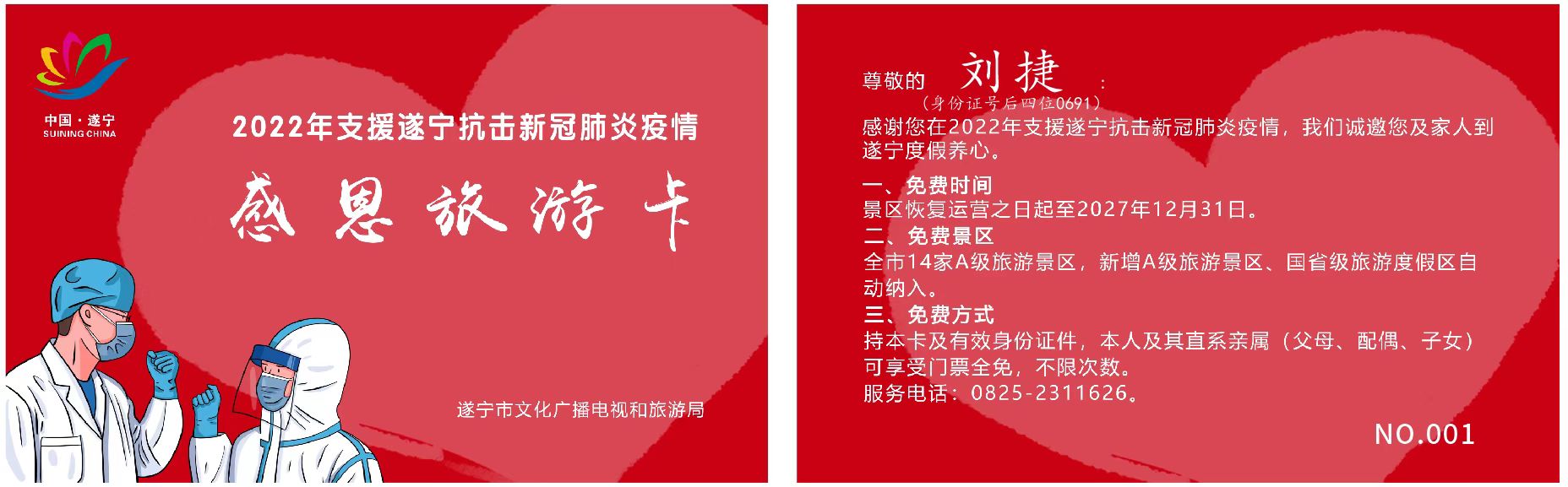 遂宁是慈善友爱之城,遂宁人民是懂得感恩的人民。为感谢他们的辛勤付出和无私奉献,中国死海、中国观音故里旅游区、舍得酒文化旅游区等14家A级旅游景区代表全市文旅行业,更代表357.6万遂宁人民,以“感恩旅游卡”的形式,集体向他们发出诚挚邀约,邀请他们及家人常来遂宁游中国死海、赏国宝宋瓷、品舍得美酒……,并提供本人及直系亲属5年内免门票的待遇,感受遂宁热情,接受遂宁礼遇。