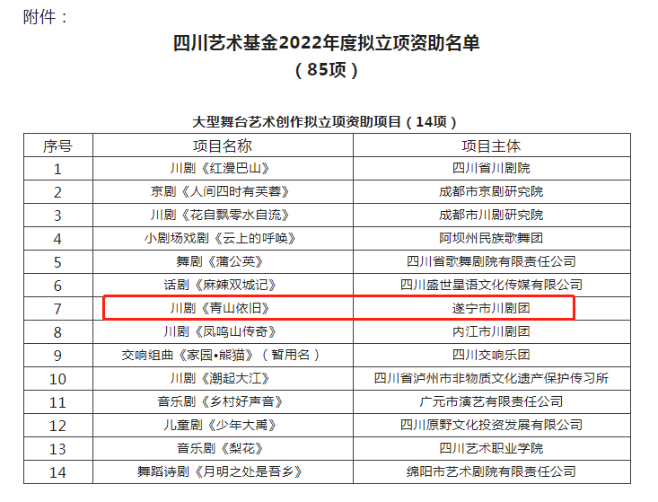 6月17日,四川省剧目工作室发布了《关于四川艺术基金2022年度拟立项资助项目的公示》,我市推荐的川剧《青山依旧》、金钱板《劫法场》2个项目入选。