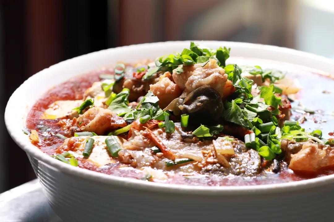 选用上好的野生青鱼,配以安居本地的手工老豆腐,再加上独家秘制的坛子肉和老坛酸菜,清泉洗之,烈油烹之,文火炖之。“和、弦、勾、扑、射”五道工序缺一不可,方成一道鲜香爽口、营养健康的美味。
