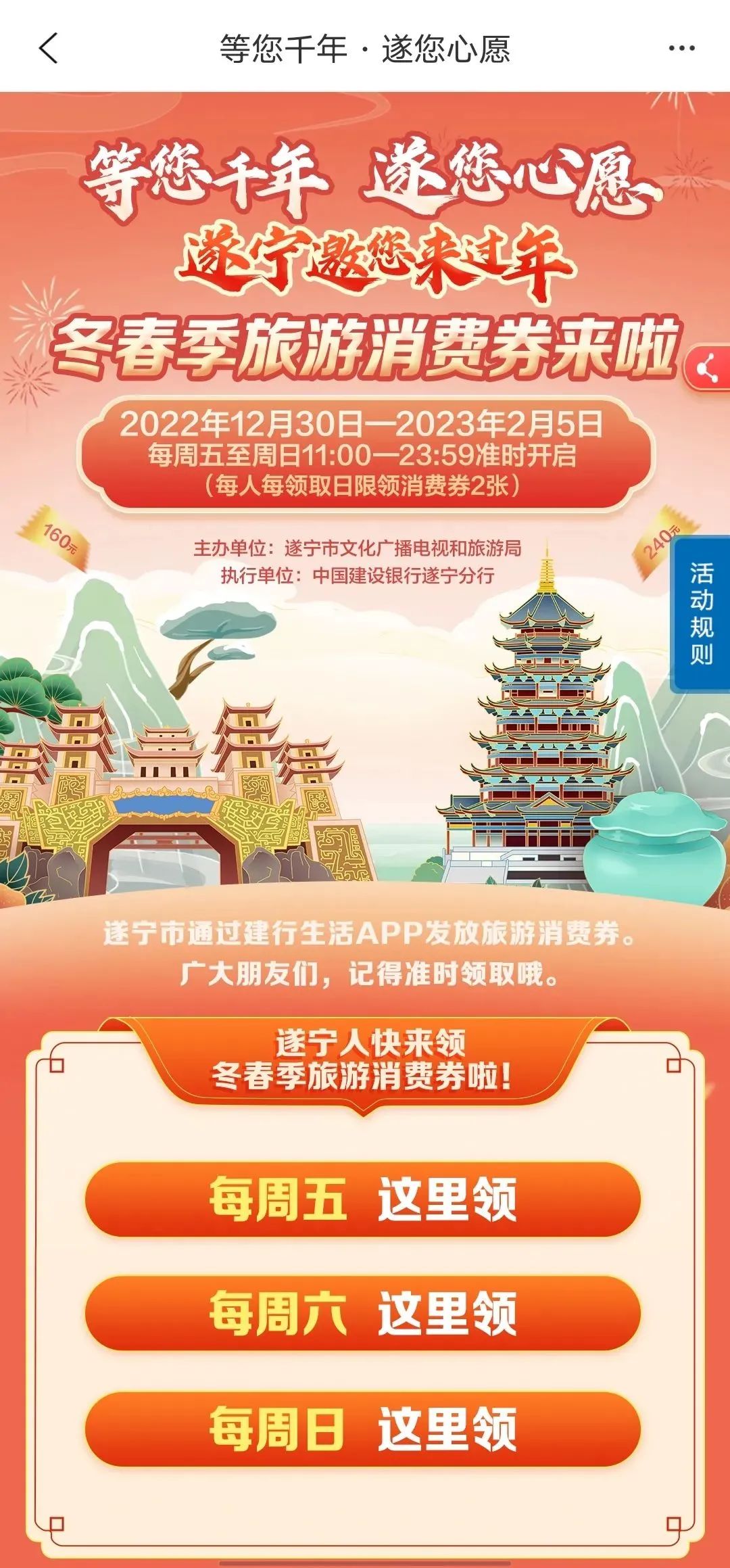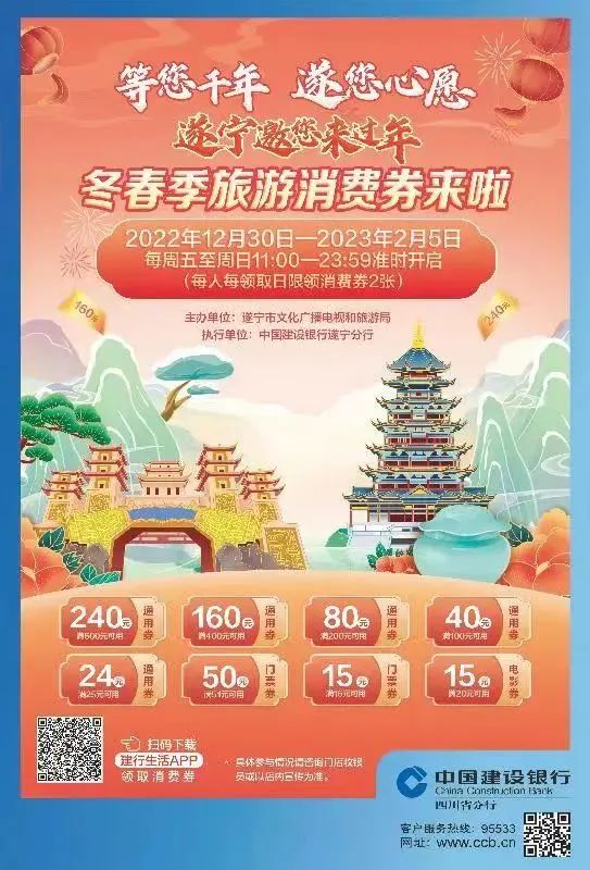 12月30日11时,“等您千年 遂您心愿——遂宁邀您来过年”2023年元旦春节文旅消费券正式上线!