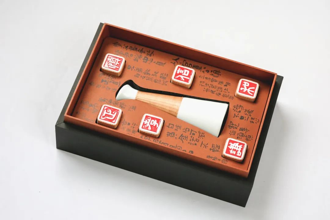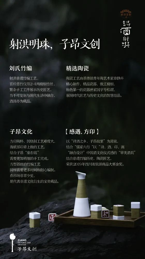 设计以“诗酒之乡·子昂故里”射洪文化及陈子昂诗作《座右铭》为源泉,结合儒家“六德六行”,以“诗、酒、画、印”融合设计,创作一款具有“中国酒文化仪式感”的东方审美酒具,扬中国情义。同时产品融合非遗竹编、陶瓷技艺,邀非遗传承人培训本地匠人手工完成。