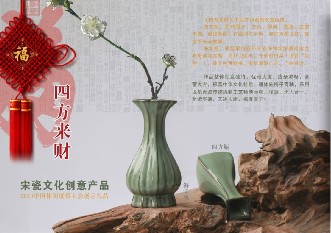 作品创意:《四方来财》由四方和海棠双瓶组成。四方瓶,高16厘米,方口、削肩、鼓腹,造型丰满,挺拔秀丽,有含四方天地、包罗万象之意,寓意平安与健康。海棠瓶,原型取自四川宋瓷博物馆馆藏南宋龙泉哥窑海棠瓶,高16.2厘米,外形似白菜(谐音“百财”),故又称百财瓶,象征财源广进、广纳贤才。
