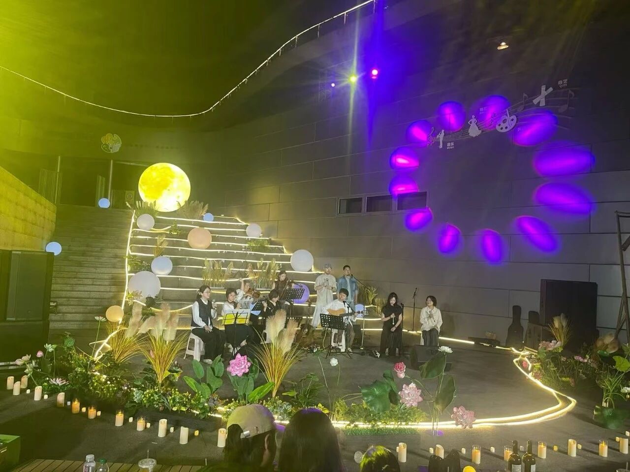 用暖黄的灯光模拟出月盈的模样,摆上露营用的桌椅,民谣歌手们坐在观众身旁,缓缓唱起一首首以“月亮”为题的歌曲。极致的简约却“玩”出了最令人动容的高级感,这是遂宁市文化馆在中秋佳节送给广大游客的舒适与惬意——2025年中秋阶梯音乐会。