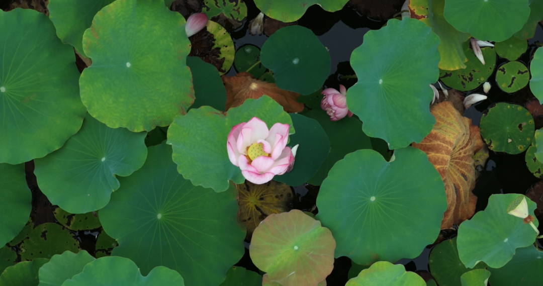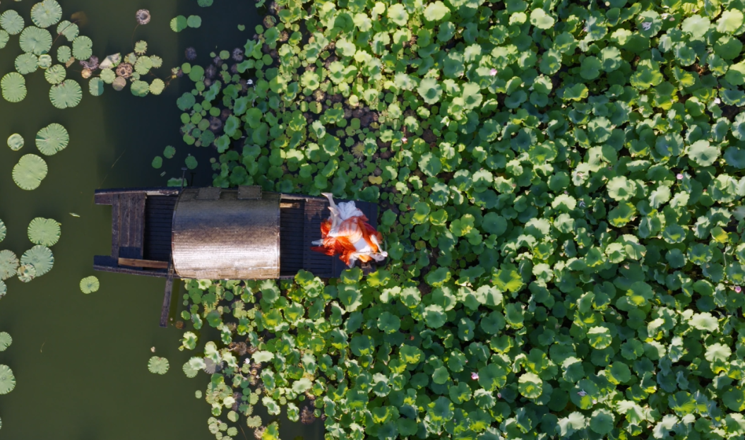 轻轻摇橹,扁舟缓缓滑入荷塘深处