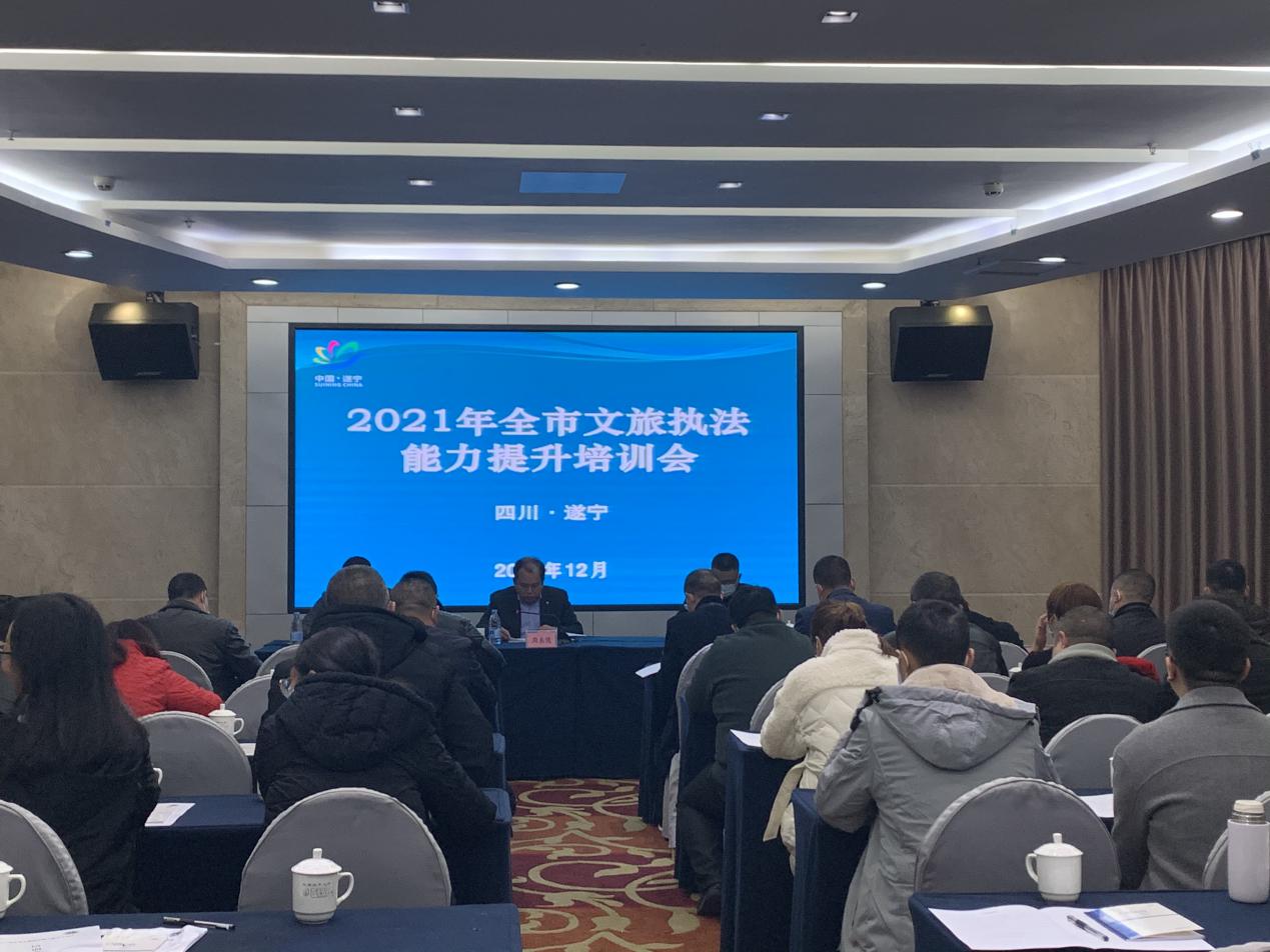 为规范管理全市文旅执法市场,着力提升全市文旅执法者的执法能力与服务水平,共同守护健康有序的文旅市场。2021年12月6日-12月7日,遂宁市文化市场综合行政执法支队举办全市文旅执法能力提升培训会。市文化广电和旅游局党组成员、副局长向永德作开班式讲话,重庆市文化市场综合行政执法总队副总队长李雅全、重庆市奉节县文化市场综合行政执法支队支队长余刚、遂宁市文化市场综合行政执法支队毛羽丰受邀授课,市文化市场综合行政执法支队长黄云主持会议,遂宁市、重庆潼南区、四川广安市等70余名执法人员参加培训。
