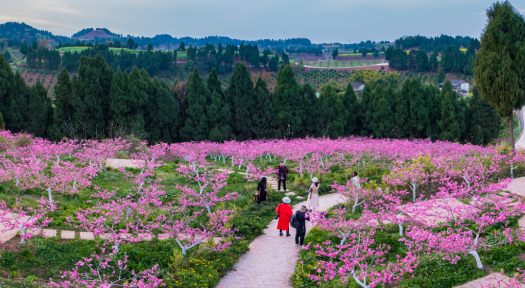 用“小而美”激发文旅消费活力,大英县卓筒井镇为干屏村有着同样的思路。作为远近闻名的桃果产业村,每逢春日该村2000余亩桃林,桃花盛开灿若云霞,漫山遍野明艳俏丽的如画美景,在近几年来年均引来40万人次的游客量。