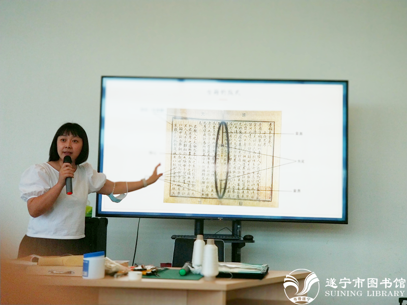 活动一开始,市图书馆刘艾丽老师先给小朋友讲述了中国古代典籍的发展历史,图文并茂地介绍了古籍的概念、版式和装帧形式。随后,20位小朋友和家长们在市图书馆老师们的带领下,开始了线装书的制作。
