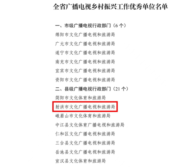 喜讯!射洪市文化广播电视和旅游局获评全省广播电视乡村振兴工作优秀单位