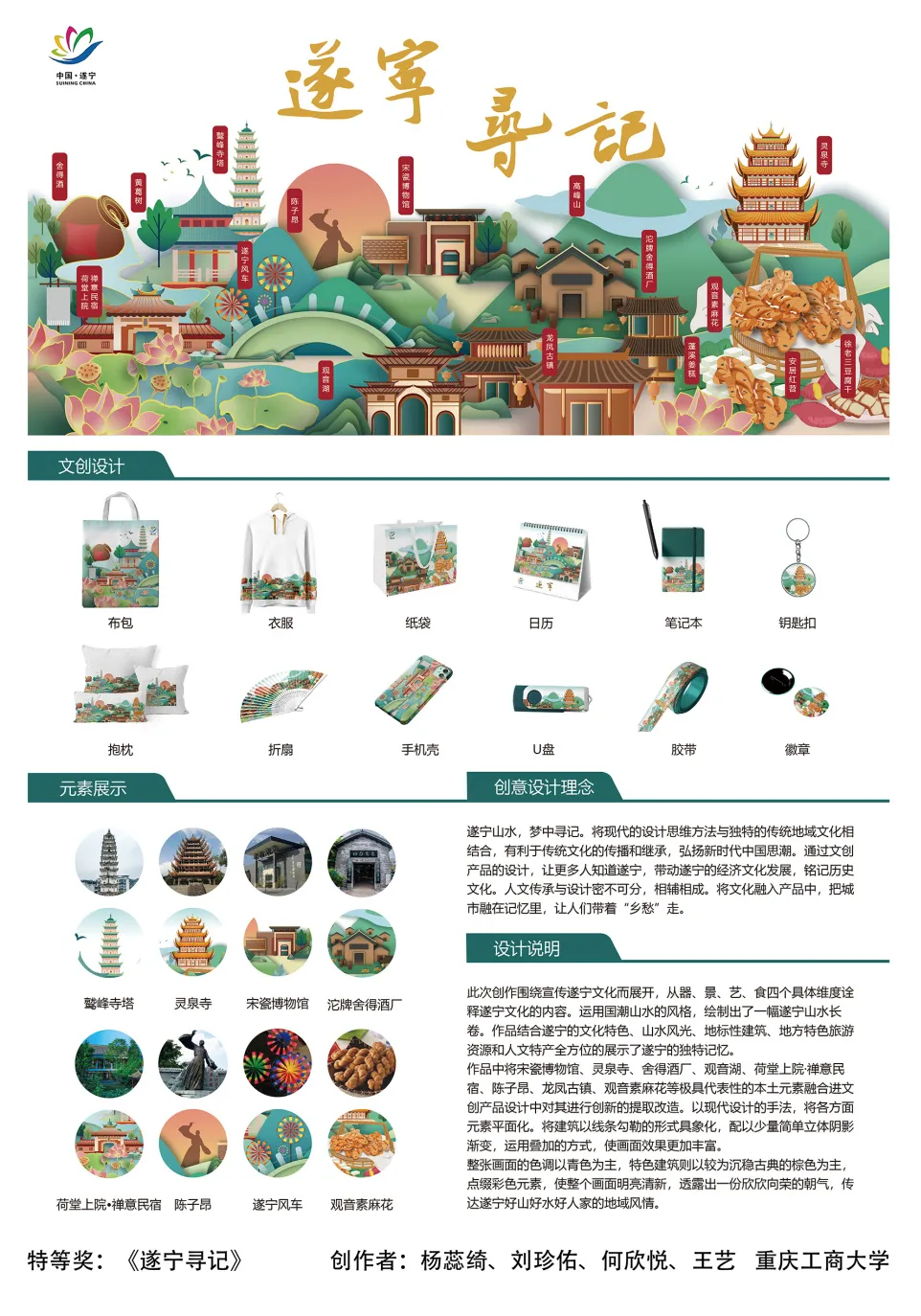 横于成渝之心,纵享绿水青山。由遂宁市文化广播电视和旅游局举办的遂宁市文创产品创意设计大赛自2021年11月1日正式启动以来,不仅在川渝高校受到了高度关注,也收获了来自北京、上海、昆明、桂林、江西、广东、南京等全国多地高校的积极响应。