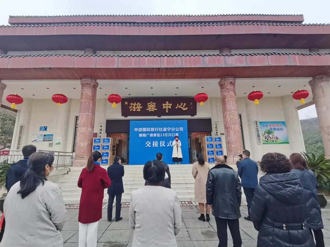 1月14日上午,中游国际旅行社遂宁分公司捐赠广德景区13万只口罩交接仪式举行。这些口罩将向市民、游客免费发放。