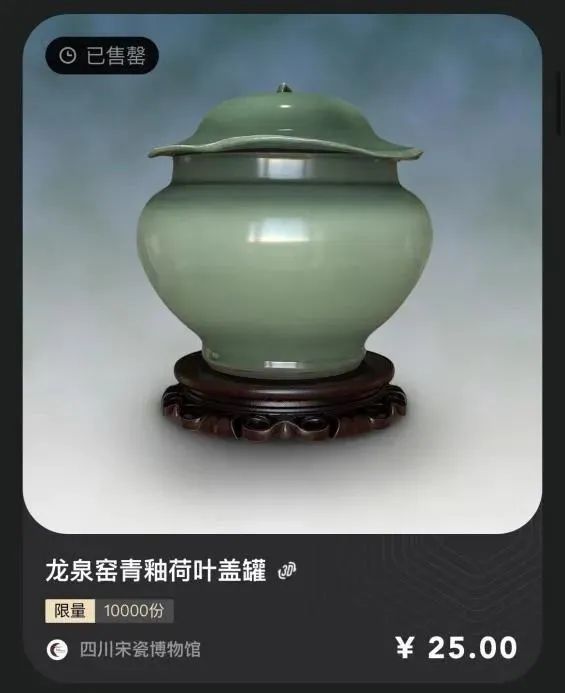 2023年3月13日,四川宋瓷博物馆携手苏州和云观博数字科技有限公司限量推出的10000份“龙泉窑青釉荷叶盖罐” 数字藏品通过支付宝鲸探平台面向全网发售,上线瞬间售罄,掀起宋瓷藏品数字化浪潮。