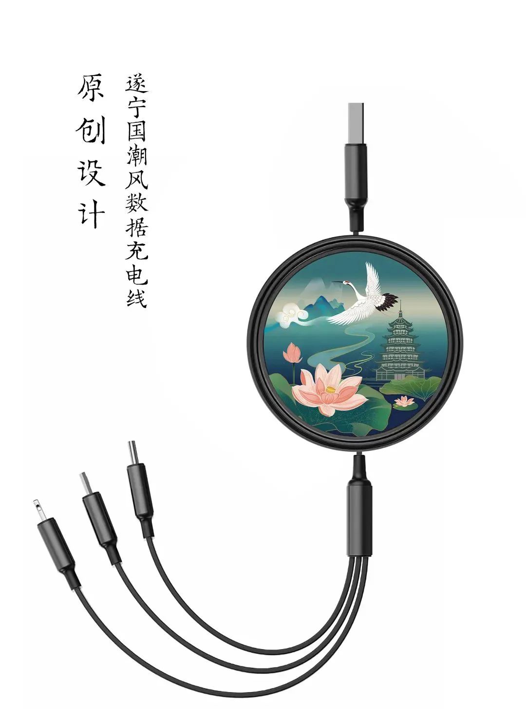 遂宁国潮风一拖三伸缩数据充电线,以遂宁市花“荷花”为主题,融入遂宁标志性建筑临仙阁,采用国潮这个属于中国风的设计理念,深受年轻人的喜爱,引领时尚的趋势。充电数据线是现代有手机的人必备的功能产品,使用的频率非常高,收纳功能便于随身携带。