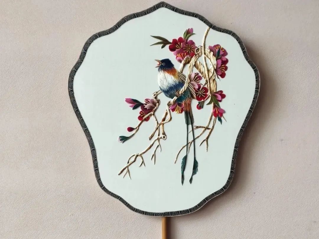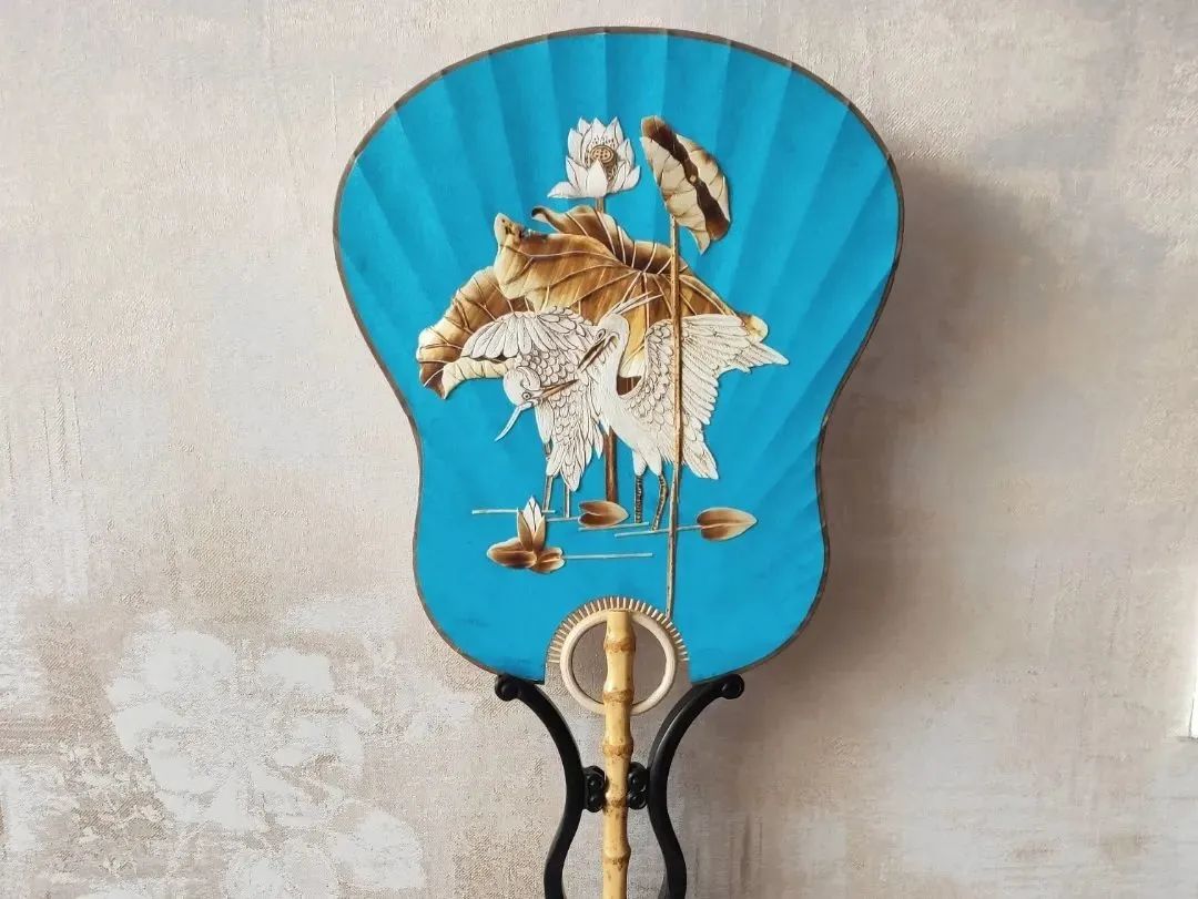 用麦秆的本身光泽和独有烙烫风格再制作成作品,再将完成的作品贴在团扇上,整个程序完成后,看上去生动形象,立体感强。