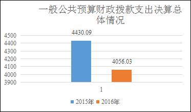 市文化广电新闻出版局及其下属单位2016年度一般公共预算财政拨款支出4056.03万元,占本年支出合计的98.93%。与2015年相比,一般公共预算财政拨款减少374.06万元,下降8.44%。(柱状图)