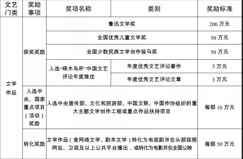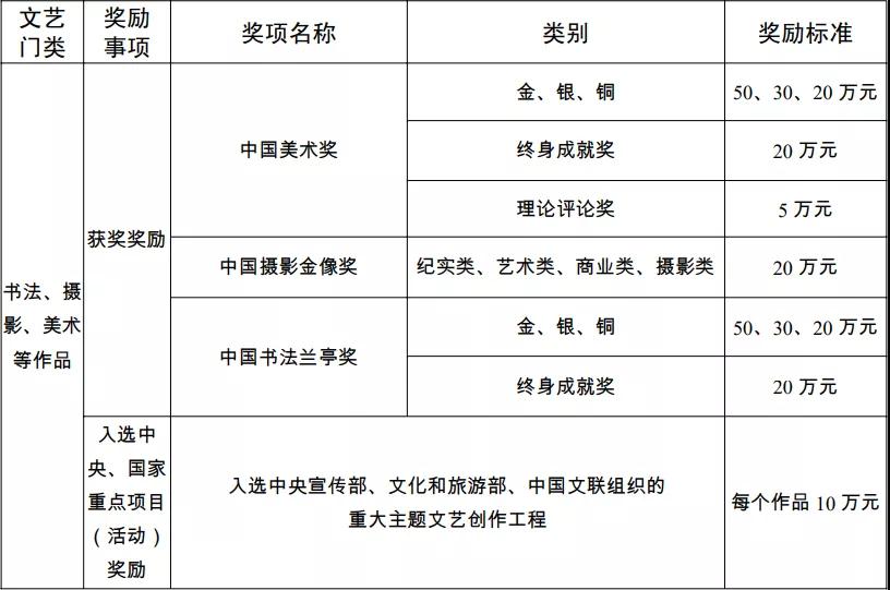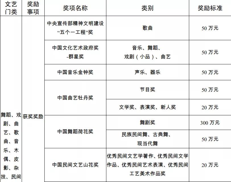 对其他文艺门类项目,在国家部委主题文艺创作工程中入选、在重要文艺奖项中获奖或在国内外产生重大影响力的,可纳入精品奖励范围,按以下条件和标准予以奖励:
