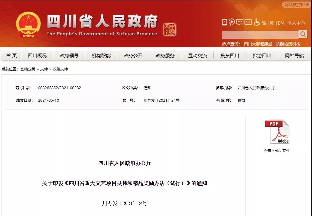 为激励我省文艺出精品、出人才、出效益、出品牌,推动我省文艺事业进一步攀高原、登高峰,加快建设文化强省,四川省人民政府日前出台了《四川省重大文艺项目扶持和精品奖励办法(试行)》,省政府将给予扶持和奖励省重大文艺项目和精品奖励,资金由省财政预算安排,年度预算规模3亿元。