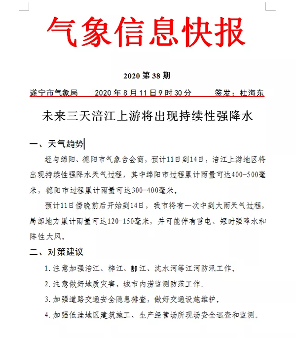 遂宁水文局8月11日16时30分发布洪水橙色预警:受上游持续强降雨及电站加大下泄影响,预计8月12日2时-12日6时,涪江干流射洪水文站洪峰流量可能达到12000至14000m³/s,超过保证流量800m³/s。根据当前雨水情变化趋势,按照《遂宁市防汛应急预案》规定,经市防汛抗旱指挥部研究决定,8月11日17时启动Ⅲ级防汛应急响应,请市防指各成员单位、相关县(市、区)防指按照职责分工,做好防汛保安各项工作。