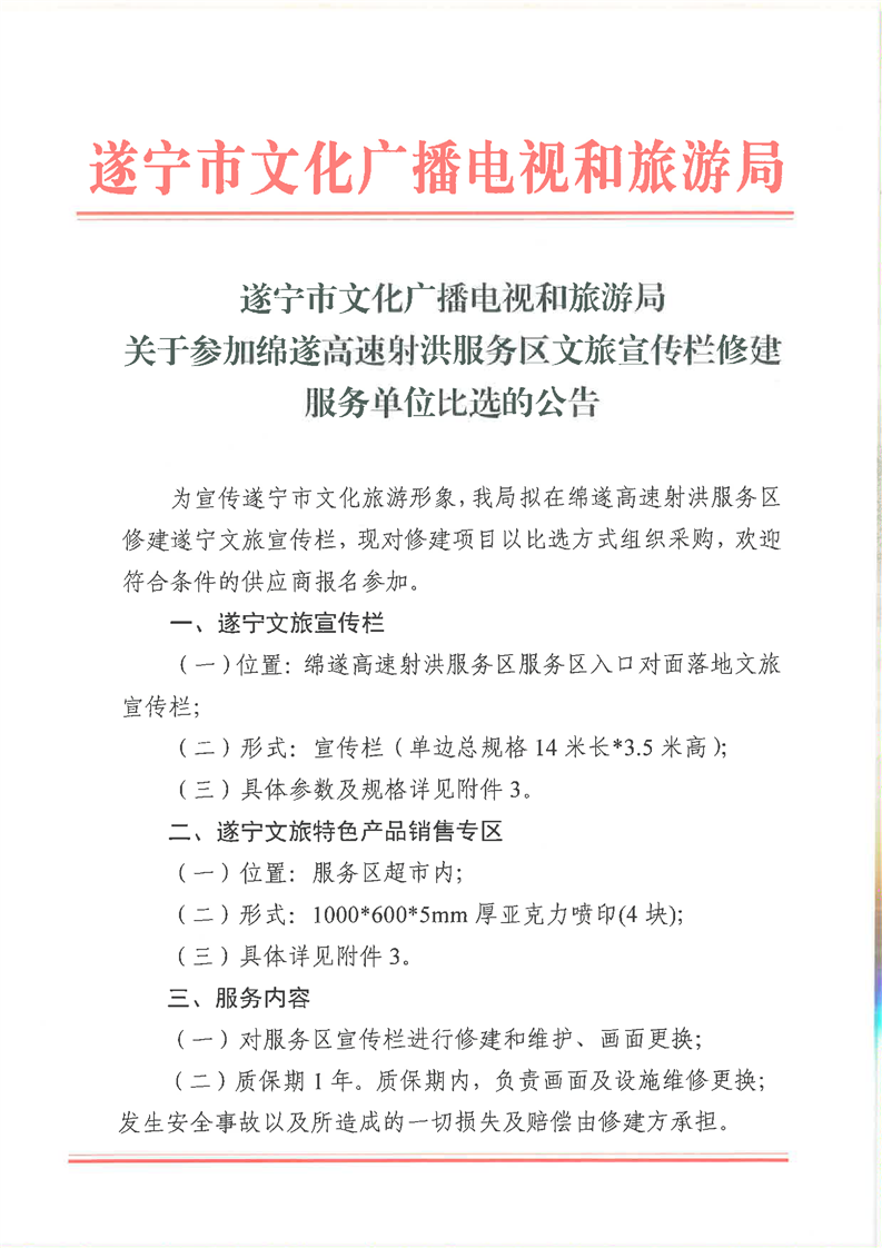 关于参加绵遂高速射洪服务区文旅商品宣传栏修建服务单位比选的公告