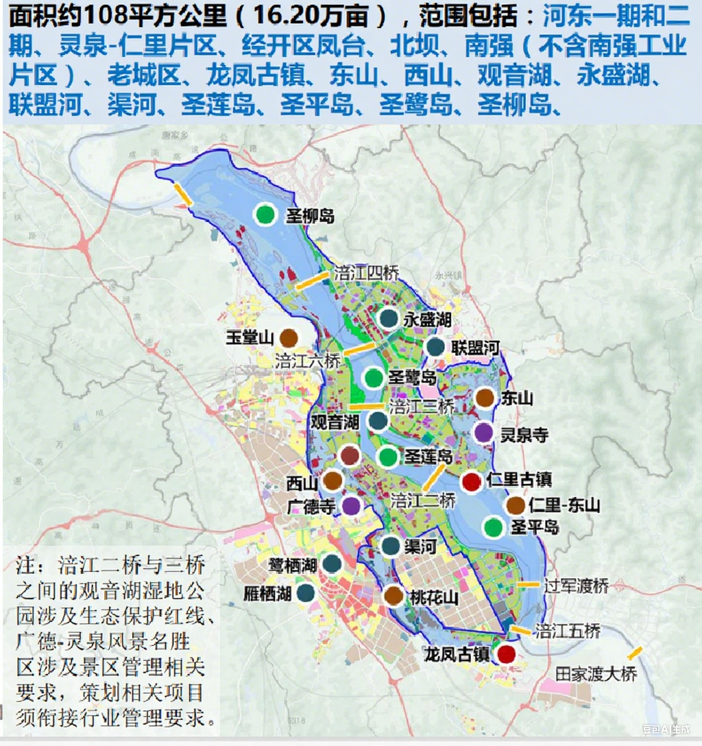 项目以遂宁中心城区为策划区域,拟立足水上、水下及涪江两岸等区域,北至黄连沱大桥、南至涪江五桥、东至灵泉东山、西至广德西山,区域面积约108平方公里,拥有26.12平方公里的西部最大城市静态活水水面,26公里城市“绿丝带”。其中,核心区北至凤台大桥、南至过军渡大桥、东西横跨涪江两岸,主要涵盖“一江两岸四岛五桥”区域。