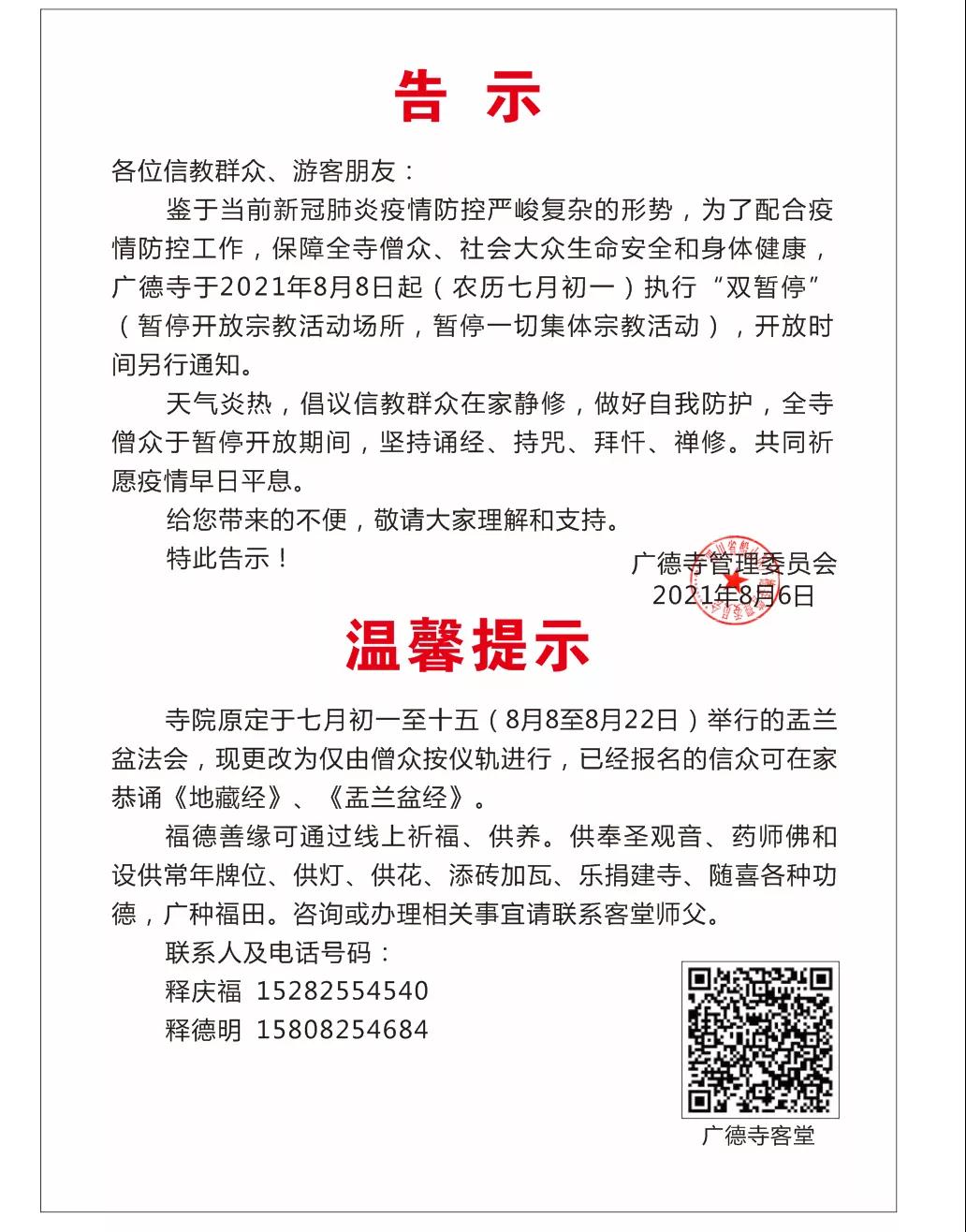 鉴于当前新冠肺炎疫情防控严峻复杂的形势,为了配合疫情防控工作,保障全寺僧众、社会大众生命安全和身体健康,广德寺于2021年8月8日起(农历七月初一)执行“双暂停”(暂停开放宗教活动场所,暂停一切集体宗教活动),开放时间另行通知。