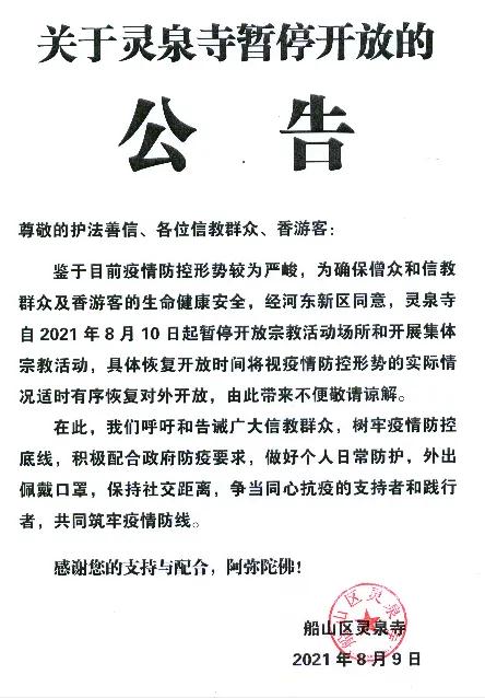 鉴于目前疫情防控形势较为严峻,未取保僧众和信教群众及香游客的生命健康安全,经河东新区同意,灵泉寺自2021年8月10日起暂停开放宗教活动场所和开展集体宗教活动,具体恢复开放时间将视疫情防控形势的实际情况适时有序恢复对外开放,由此带来不变敬请谅解。