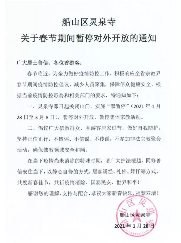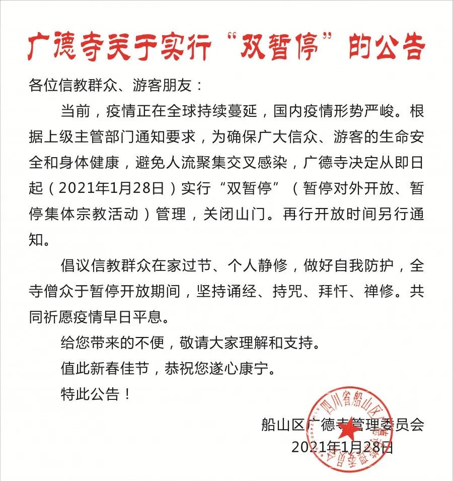 疫情期间为避免人流聚集交叉感染遂宁两大寺庙在1月28日起实行“双暂停”管理(暂停对外开放、暂停集体宗教活动)